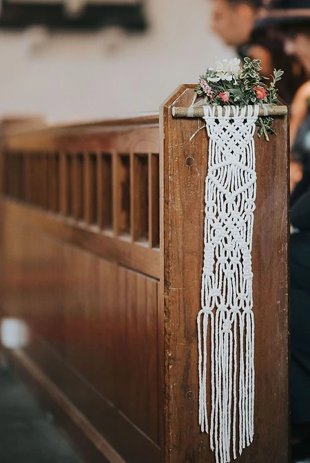 Church weddings- but make it boho! This bride shot by Jo Greenfield chose to dress up their local church's aisles with flowers and dainty little macrame pieces that instantly gave the place a boho touch.
